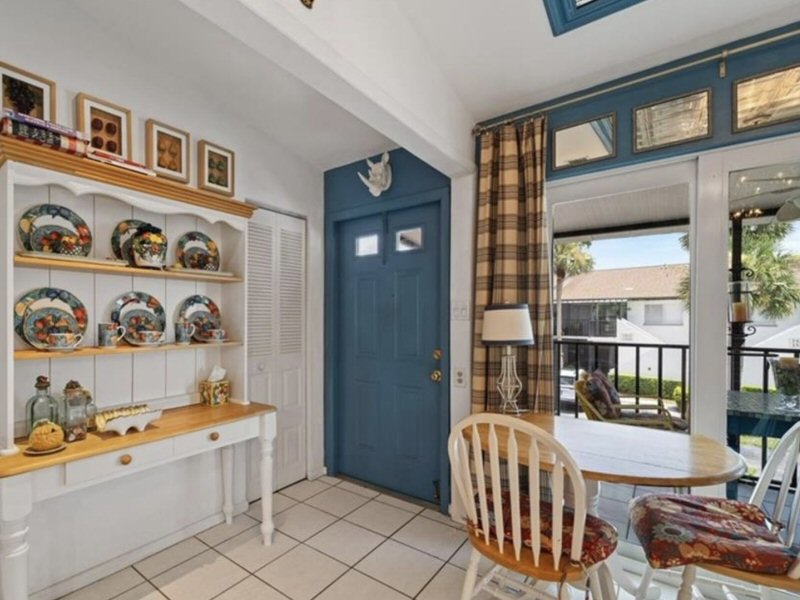 Eingang und Frühstücksbereich zur Rechten. Fliesenboden, hohe Decke und ein Oberlicht.