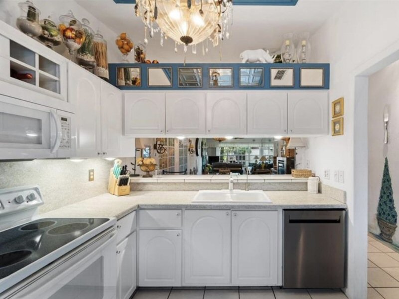 Küche. Boden mit hellen Fliesenmustern. Schränke mit Glaseinsätzen.
