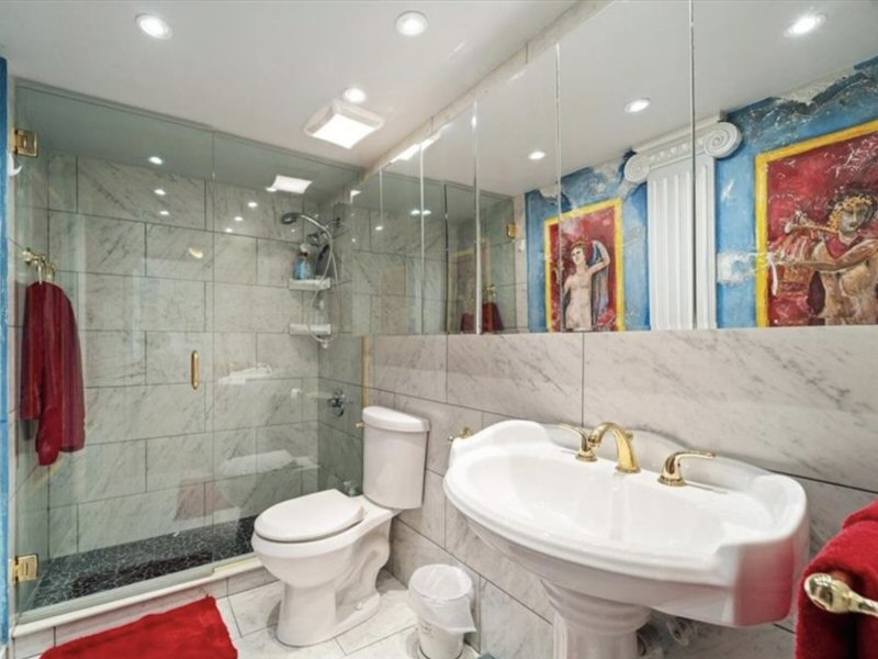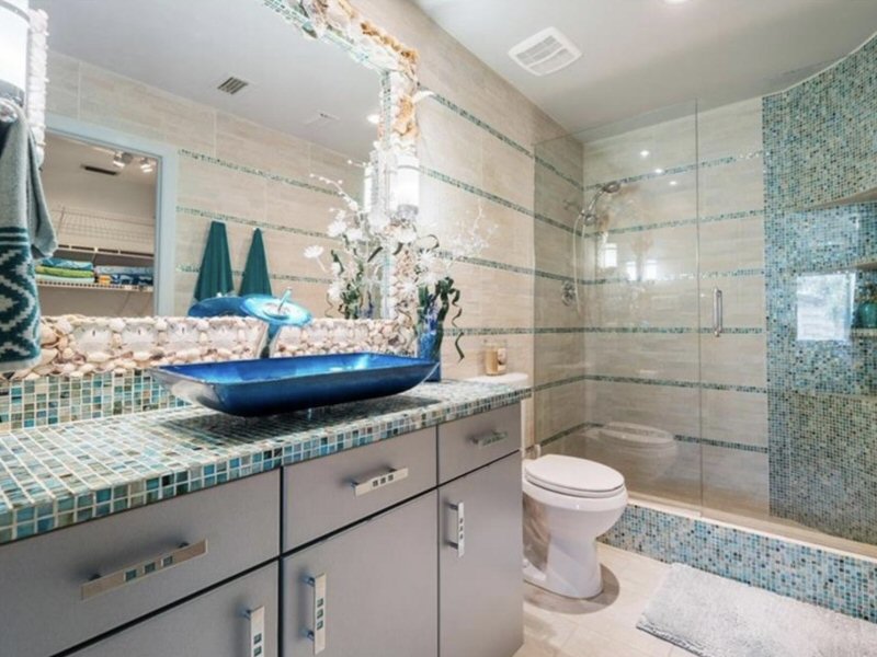 Badezimmer neben dem Master-Schlafzimmer mit gefliesten Wänden und Böden, Duschkabine, Einbauleuchten.