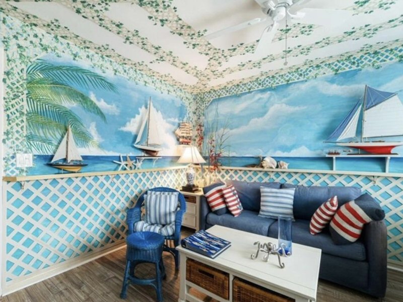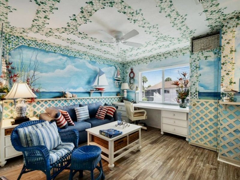 Wohnzimmer mit tapezierten Wänden, Deckenventilator, Holzboden.